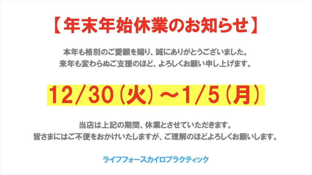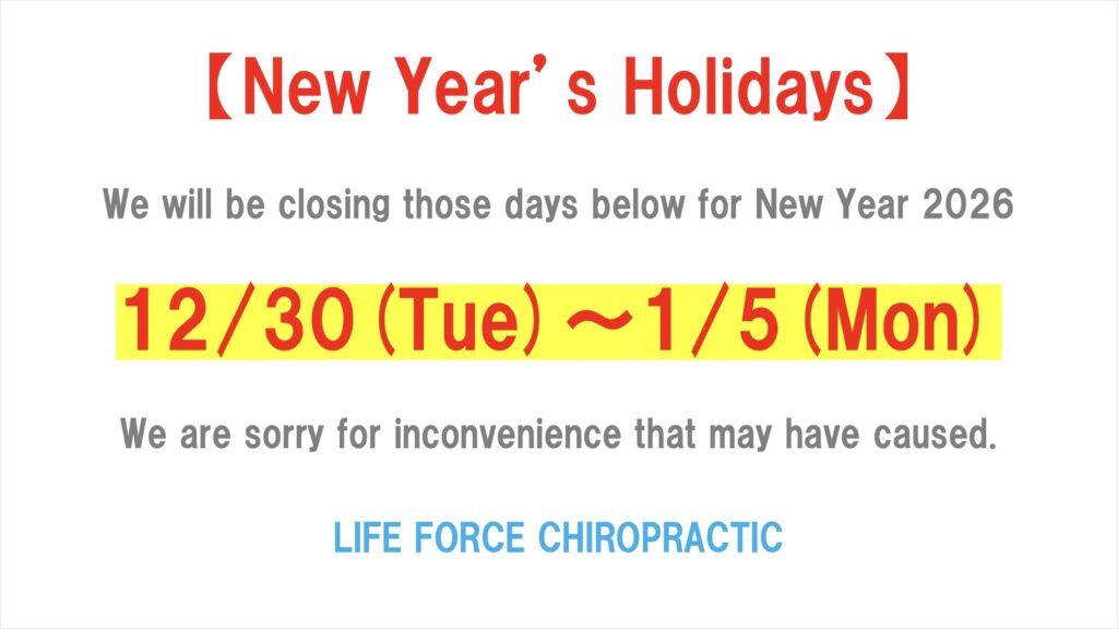 Notice of Year-end and New Year holidaysDec 9, 2025kawamitsudcHospital InformationChiropractor, massage, Chiropractic, chiropractic, massage, Setai (manipulative therapy based on Chinese and Japanese traditional medicine) Thank you very much for your continued patronage this year. We look forward to your continued support in the coming year. 12/30(火)~1/5(月) 当店は上記の期間、休業とさせていただきます。皆様にはご不便おかけしますが、ご理解の程よろしくお願いします。 Life Force Chiropractic