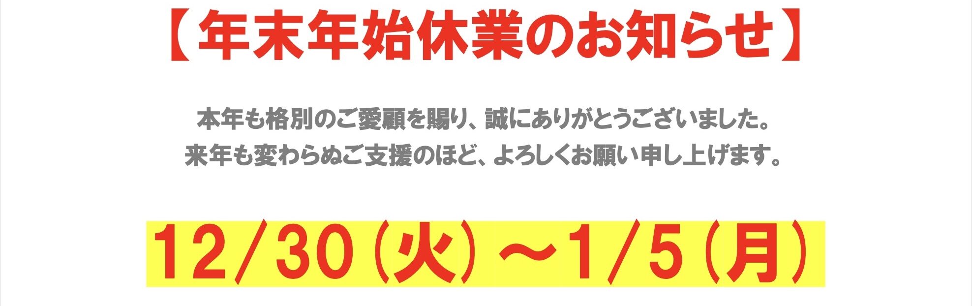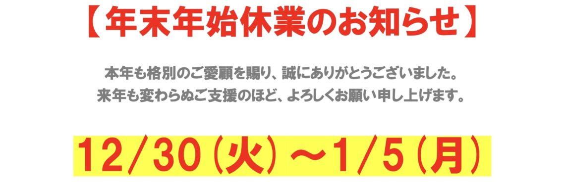 【年末年始休業のお知らせ】 12月 9, 2025kawamitsudc 院内情報Chiropractor, massage, カイロプラクティック、chiropractic, マッサージ, 整体 本年も格別のご愛顧を賜り、誠にありがとうございました。来年も変わらぬご支援のほど、よろしくお願い申し上げます。 続きを読む