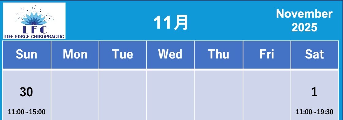 11月営業日時 10月 28, 2025kawamitsudc 院内情報Chiropractor, Ginowan, Okinawa, カイロプラクティック、chiropractic, ライフフォースカイロプラクティック、